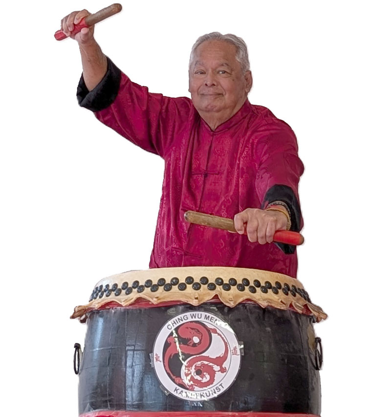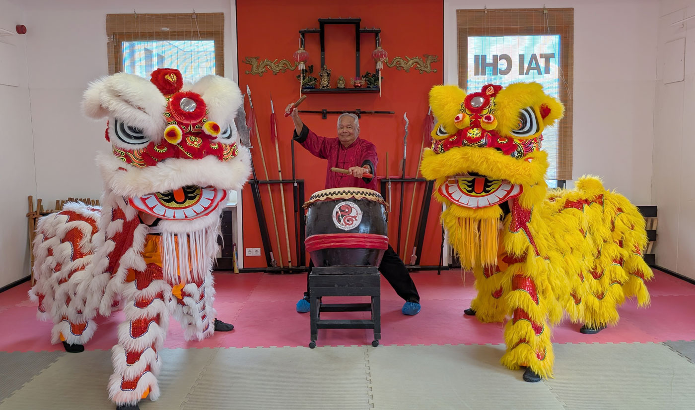 Ein Löwentanz wäre jedoch ohne die dazugehörigen Instrumente nur halb so imposant. Deshalb beinhaltet das Training auch eine Einweisung in die Instrumente der Trommel, der Zimbel und des Gongs.